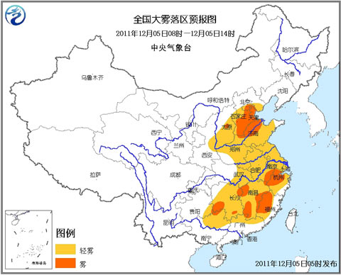 中央气象台12月5日06时继续发布大雾蓝色预警: