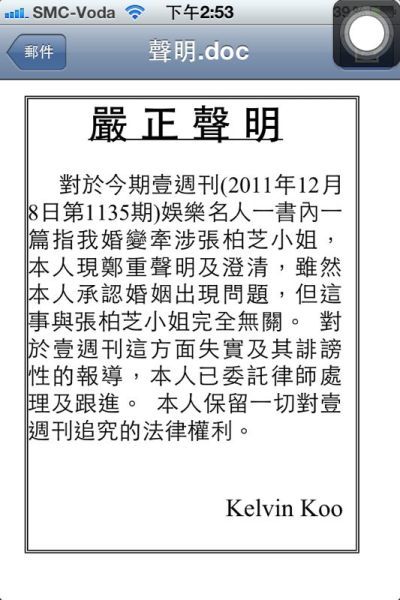 对于今期《壹周刊》(2011年12月8日第1135期)娱乐名人一书内一篇指我婚变牵涉张柏芝小姐,本人现郑重声明及澄清,虽然本人承认婚姻出现问题,但这事与张柏芝小姐完全无关。对于壹周刊这方面失实及其诽谤性的报道,本人已委托律师处理及跟进。本人保留一切对《壹周刊》追究的法律权利。