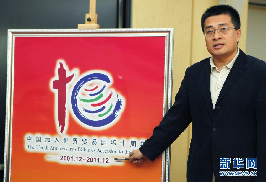 11月21日,商务部世贸司副司长鄂德峰在介绍纪念标识。当日,中国加入世界贸易组织十周年纪念标识在北京发布。标识中用毛笔绘出的红色华表代表阿拉伯数字“1”又代表汉字“十”,蕴含“中国”之意。毛笔绘出的圆圈代表阿拉伯数字“0”蕴含“世界”之意。圆圈中毛笔绘出的六条彩带为WTO标识。华表与地球构成“10年”,再与WTO标识一起构成中国入世十周年之意,整个标识寓意“中国书写融入多边贸易体制的十年历程”。新华社发(万象 摄)