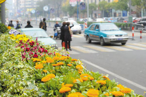 昨天,在开明街人行道旁的隔离栏上,城管部门刚安装了一排排攀缘植物与鲜花,这给寒冷的冬日带来一道亮丽的色彩。今年,海曙区陆续在部分城市道路沿线的围墙、栏杆、高架桥柱、公厕等处栽植了鲜花与攀缘植物,使之形成绿色幕墙,以进一步增加城市的绿量。