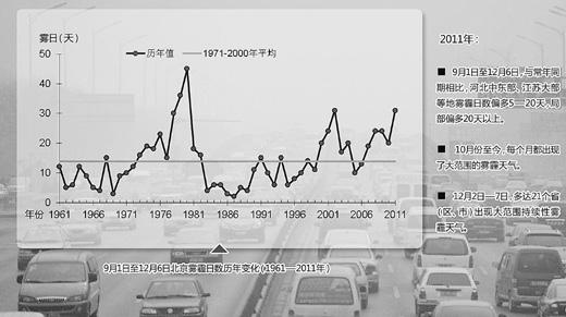 国家气候中心监测显示,1961—2010年,全国平均的年霾日数呈显著增加趋势。本世纪以来,全国霾日数增加明显,中东部地区霾日数有显著增多趋势。