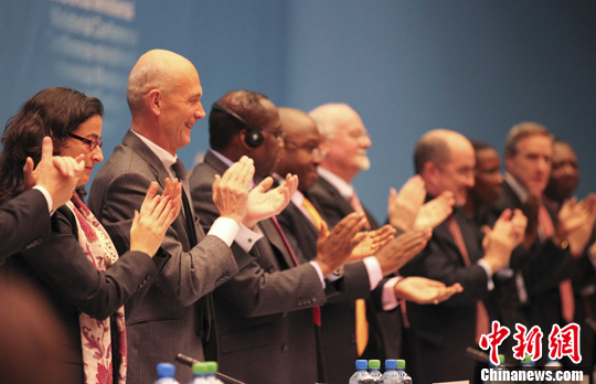 12月16日下午,在瑞士日内瓦举行世界贸易组织第八届部长级会议正式批准俄罗斯加入世贸组织。世界贸易组织总干事帕斯卡尔·拉米(左二)与其他同仁起立鼓掌欢迎俄罗斯“入世”。中新社记者 沈晨 摄