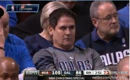 镜头在间歇扫到小牛老板马克-库班,只见库班板着脸,满脸都是黑气,真是一个要杀人的表情。