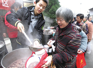 昨天早上,海曙区月湖盛园商圈党员志愿者正在县学社区向居民免费派送“腊八粥”。从当天起到腊月初八,商圈内清源茶馆将每天煮熬3大桶腊八粥,由志愿者轮流分送给行人品尝。