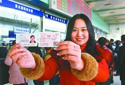1月1日,一名旅客在扬州火车站售票大厅内展示自己的身份证和购买的实名制火车票。当日起,覆盖全国所有车次的火车票实名制在全国范围内开始实施。 新华社发□本报记者林江丽