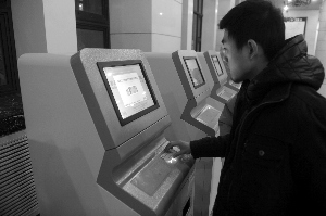 近日,旅客在铁路北京站东售票厅的互联网自助取票机上取火车票。晨报记者 王巍/摄