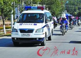 警车为骑摩托车回江西的外来工开道。记者叶仕欣 摄