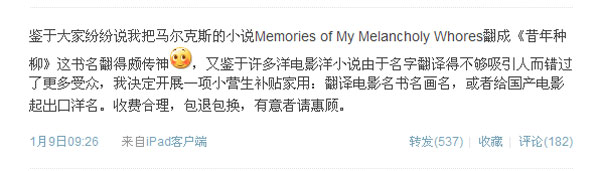 继宋柯转行卖烤鸭后,音乐人高晓松也在微博做起副业,为电影、书名英汉互译“补贴家用”。高晓松昨日发微博称:“鉴于大家纷纷说我把马尔克斯的小说《Memories of My Melancholy Whores》翻成《昔年种柳》这书名翻得颇传神,又鉴于许多洋电影洋小说由于名字翻译得不够吸引人而错过了更多受众,我决定开展一项小营生补贴家用:翻译电影名书名画名,或者给国产电影起出口洋名。收费合理,包退包换,有意者请惠顾。”