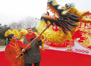 中国宁波网讯 墙上挂着墨迹未干的“龙”字、桌上放着形态各异的“龙”画、手里拿着刚出炉的龙形年糕、舞龙队员舞起了富有浓郁乡土气息中国布龙……昨天下午,来自美国、英国、法国等国家的十几个老外来到世博乡村滕头村,和当地的村民一起舞龙、写龙、画龙、做龙,以一场别开生面的龙文化盛宴喜迎龙年春节。
