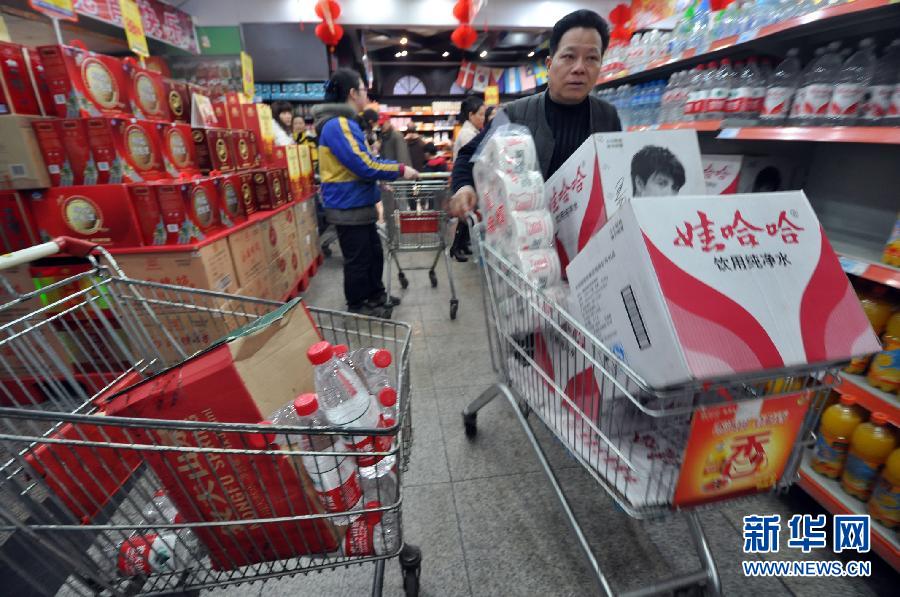 1月25日,人们在广西柳州一超市内抢购瓶装饮用水。 日前,广西河池宜州市境内的龙江河发生镉浓度超标事件,受此影响,1月24日晚间至25日,下游广西柳州市的多个超市发生抢购瓶装饮用水事件。据柳州水情部门监测,目前,柳江干流水质安全。 新华社发