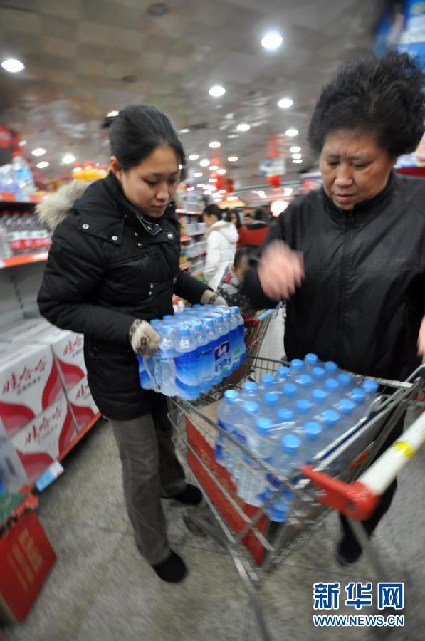 1月25日,人们在广西柳州一超市内抢购瓶装饮用水。 日前,广西河池宜州市境内的龙江河发生镉浓度超标事件,受此影响,1月24日晚间至25日,下游广西柳州市的多个超市发生抢购瓶装饮用水事件。据柳州水情部门监测,目前,柳江干流水质安全。 新华社发