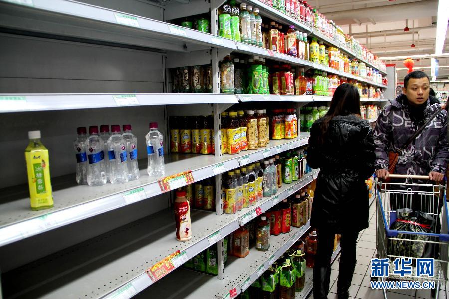 1月25日,广西柳州一家大型超市瓶装饮用水暂时断货。 日前,广西河池宜州市境内的龙江河发生镉浓度超标事件,受此影响,1月24日晚间至25日,下游广西柳州市的多个超市发生抢购瓶装饮用水事件。据柳州水情部门监测,目前,柳江干流水质安全。 新华社发
