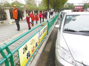 为更好地保证学生上下学的交通安全,江东交警大队已在江东外国语实验小学、江东中心小学校门口安装起绿色醒目的隔离栏。接下来,全辖区将推广安装。图为昨天一大早,江东外国语实验小学的学生在志愿者的引导下通过“绿色通道”。王鹏
