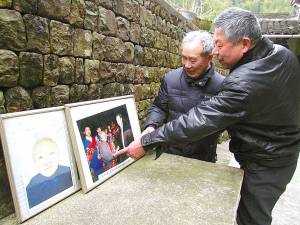 袁武强(左)和镇干部一起回忆当年母亲到宁波领奖的事。