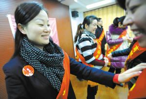 近日,江东福明街道碧城社区雷锋团宣布成立,随后开展了便民服务活动。雷锋团的成员由宁波眼科医院、宁波银行、杭州银行等7家单位的志愿者组成。图为雷锋团成员在佩戴印有雷锋头像的雷锋团标志。
