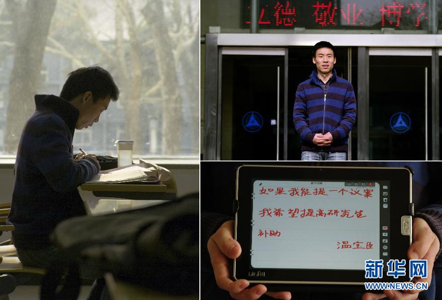 温宝臣,中国传媒大学文学院硕士研究生三年级学生,内蒙古人,26岁。左:温宝臣在位于北京定福庄的中国传媒大学48号楼的教室里上自习,准备公务员考试。右上:温宝臣站在教学楼门口。右下:温宝臣在平板电脑上写下他的希望——提高研究生补助(2月15日摄)。新华社记者 翟健岚 摄
