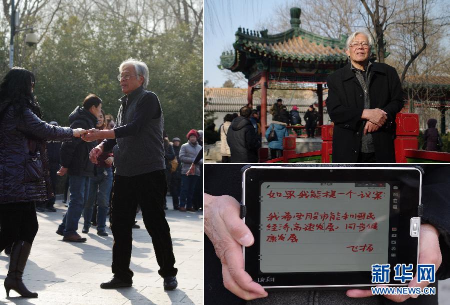 李大爷,笔名“飞扬”,已退休,福建人,68岁,股龄约20年。左:李大爷(右)和舞伴在菖蒲河公园内跳舞。右上:李大爷站在公园的一座小桥上。右下:李大爷在平板电脑上写下他的希望——股市能和国民经济同步高速发展、健康发展(2月18日摄)。新华社记者 翟健岚 摄