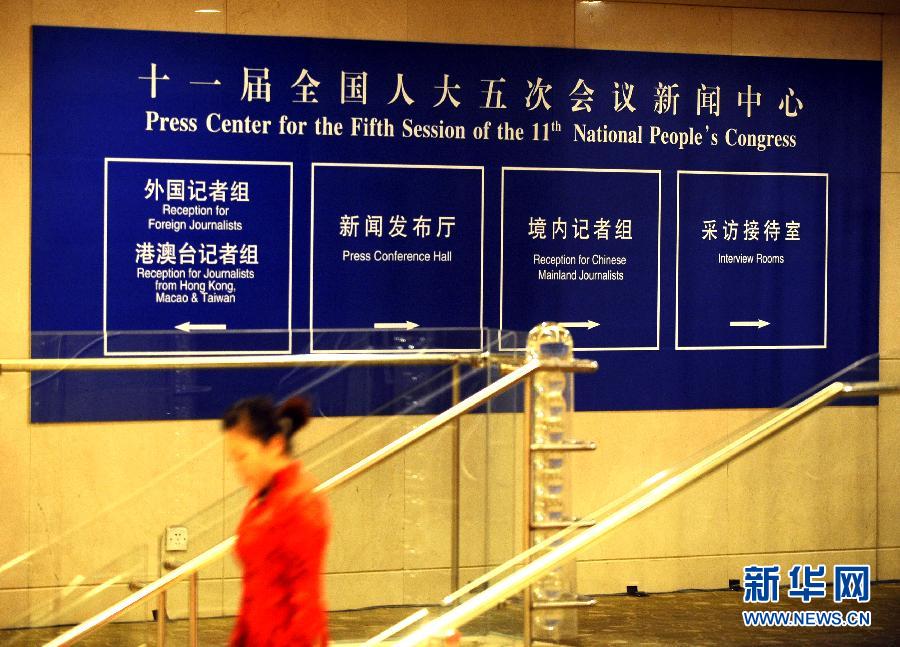 2月26日,一名工作人员从全国两会新闻中心的标识牌旁走过。当日,设在北京西长安街北侧梅地亚中心的全国两会新闻中心正式开展工作。十一届全国人大五次会议和全国政协十一届五次会议将分别于3月5日和3月3日在北京开幕。新华社记者燕雁摄