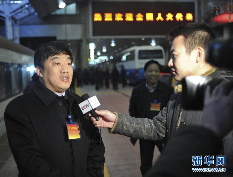 湖北代表团抵京 3月2日,来自湖北省的全国人大代表乘火车抵达北京,参加十一届全国人大五次会议。这是朱汉桥代表在接受记者采访。 新华社记者 王晔 摄