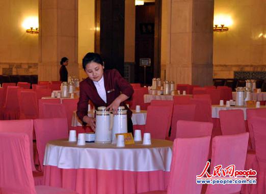 人民网北京3月10日电 (记者黄子娟)清晨,不到7点,人民大会堂的工作人员已经在为会场做准备工作。良好的工作状态和细致的服务工作,让清晨又增添了一份暖意。