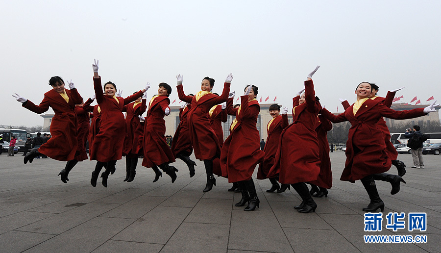 2012年3月5日上午9时,第十一届全国人民代表大会第五次会议在人民大会堂开幕。图为开幕会当天全国两会住地宾馆酒店礼仪小姐天安门广场上留影。新华网 陈竞超 摄