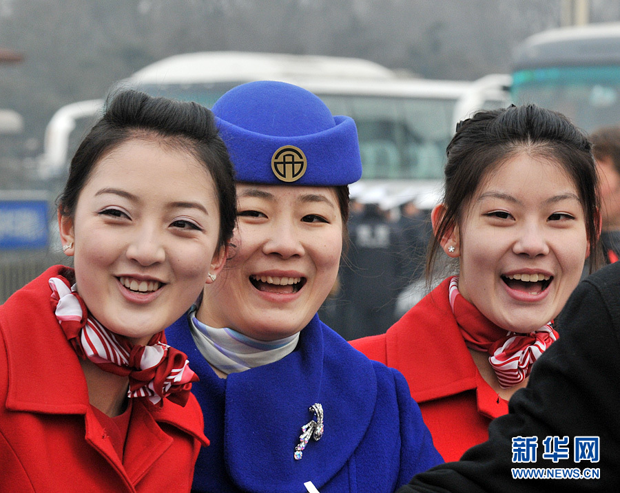 2012年3月5日上午9时,第十一届全国人民代表大会第五次会议在人民大会堂开幕。图为开幕会当天全国两会住地宾馆酒店礼仪小姐天安门广场上留影。新华网 陈竞超 摄