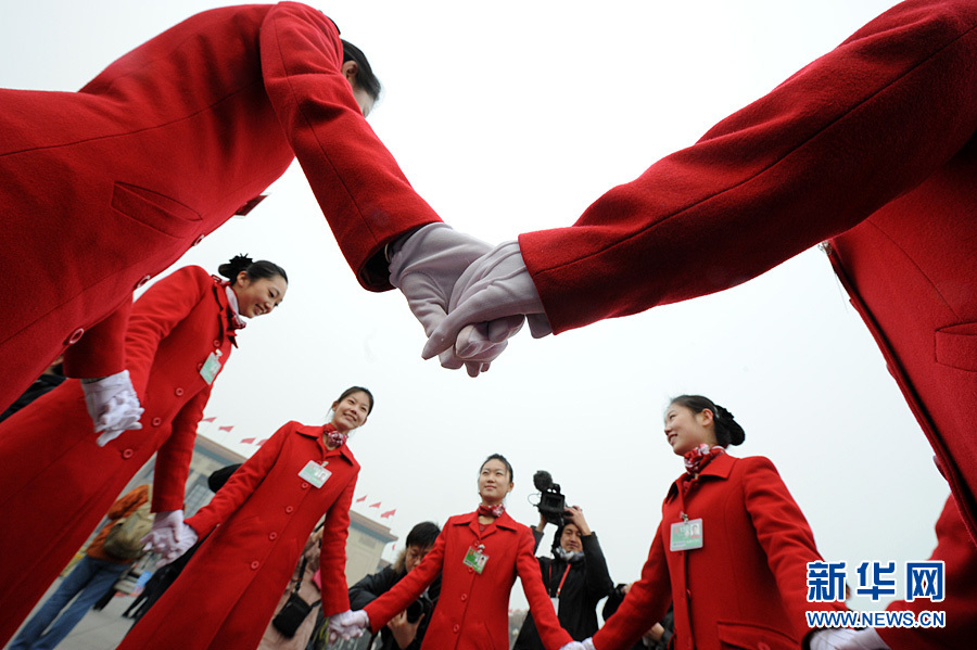 2012年3月5日上午9时,第十一届全国人民代表大会第五次会议在人民大会堂开幕。图为开幕会当天全国两会住地宾馆酒店礼仪小姐天安门广场上留影。新华网 陈竞超 摄