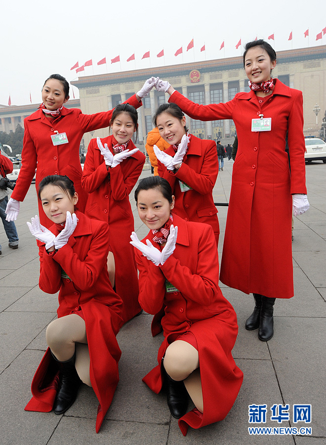 2012年3月5日上午9时,第十一届全国人民代表大会第五次会议在人民大会堂开幕。图为开幕会当天全国两会住地宾馆酒店礼仪小姐天安门广场上留影。新华网 陈竞超 摄