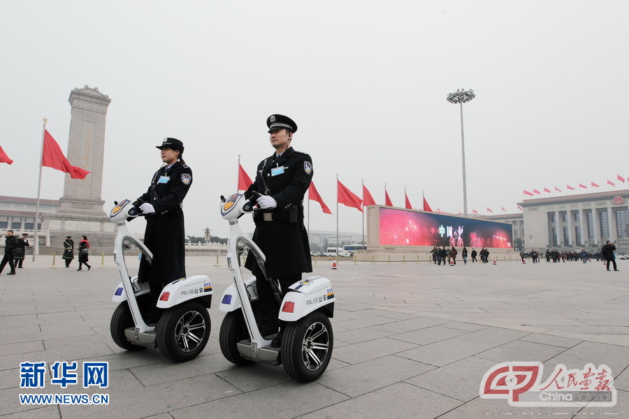 3月3日,中国人民政治协商会议第十一届全国委员会第五次会议在北京人民大会堂开幕。图为广场上巡逻的警察。