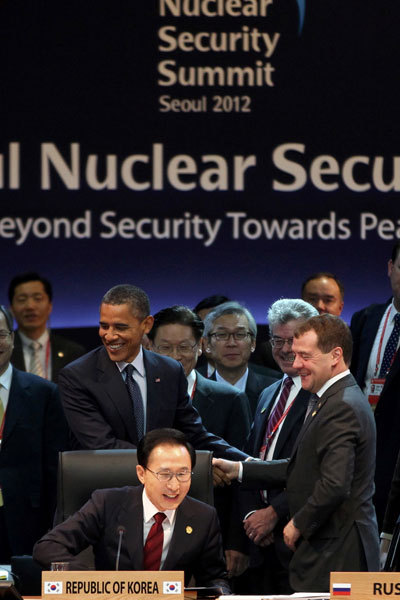 3月27日,首尔核安全峰会第一次全会上的奥巴马与梅德韦杰夫交谈。