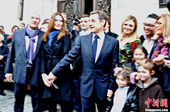 4月22日上午,正在谋求连任的法国总统萨科齐偕夫人布吕尼来到巴黎16区的一处投票站参加总统选举第一轮投票,引来大批媒体和支持者围观。王小凤 摄