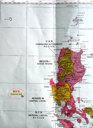 (上图为1990年代菲律宾政府官方地图,黄岩岛在菲律宾领土界线以外)