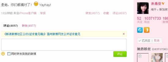 新浪娱乐讯 北京时间5月7日消息,近日有报道称,孙燕姿在结婚满一周年(5月8日)的前夕透露自己怀孕消息,并表示这是他们夫妻最好的结婚周年贺礼。对此,孙燕姿通过微博承认了怀孕的喜讯:“是地,你们都猜对了!Yayhay!”