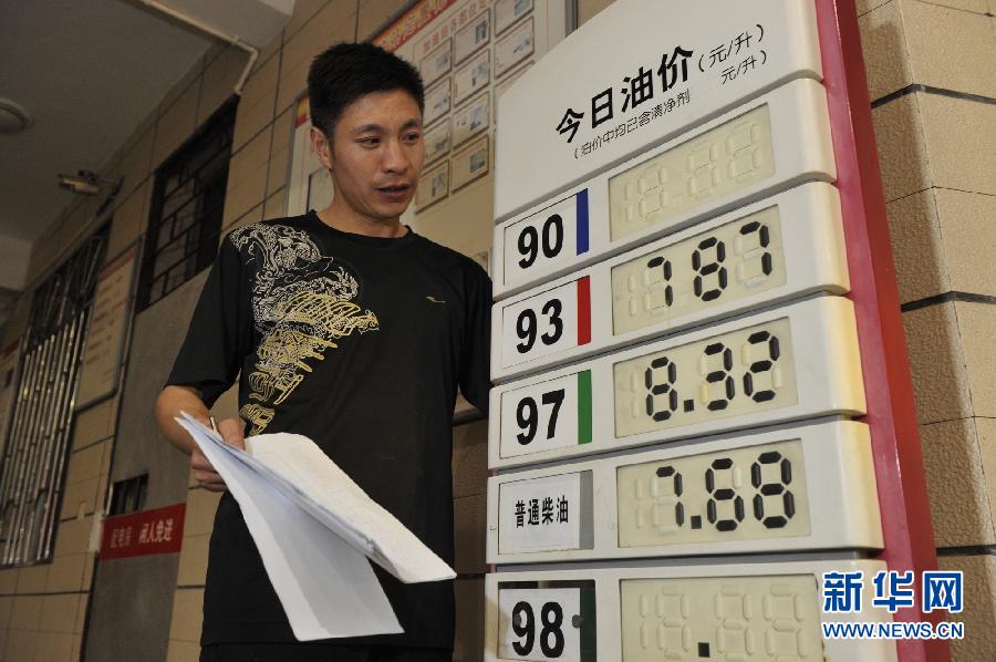 5月10日凌晨,加油站工作人员在贵阳一家加油站内调整价目表。国家发展和改革委员会5月9日宣布,自5月10日零时起将汽、柴油价格每吨分别降低330元和310元,相当于零售价格90号汽油和0号柴油(全国平均)每升分别降低0.24元和0.26元。这是今年来我国首次下调成品油价格。新华社记者欧东衢摄