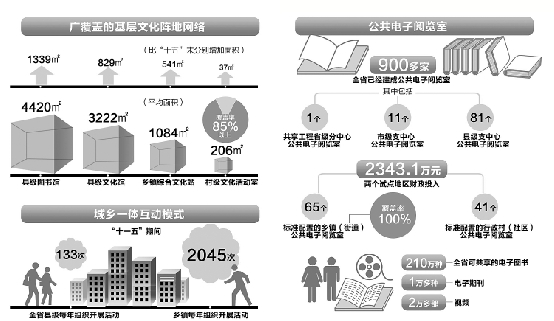 如今,此类惠民工程深入农村,足不出村就可看到城市文艺院团的精彩节目,每月还可看一场电影;在村图书室就能借到杭州城区所有图书馆的书籍;足不出户就可观看数字电视,收听有线和无线广播……文化成为群众生活中不可缺少的‘一日三餐’。