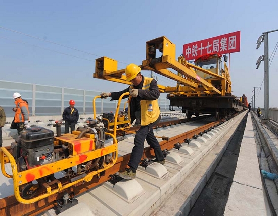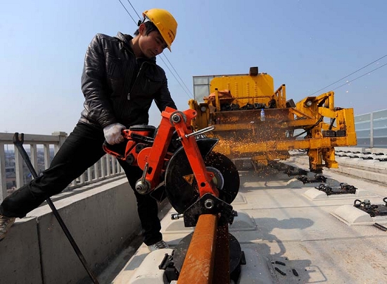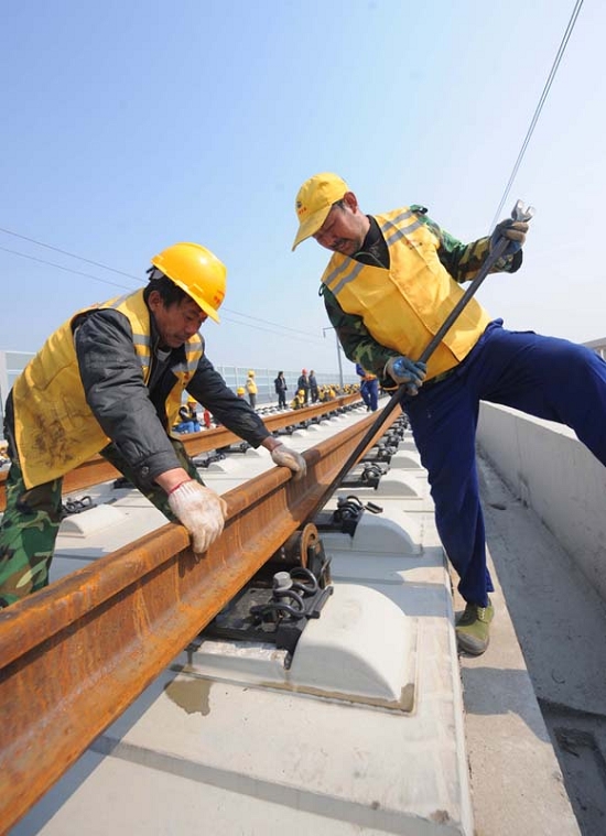 3月13日,施工人员正在给刚铺设好的钢轨紧固螺丝。