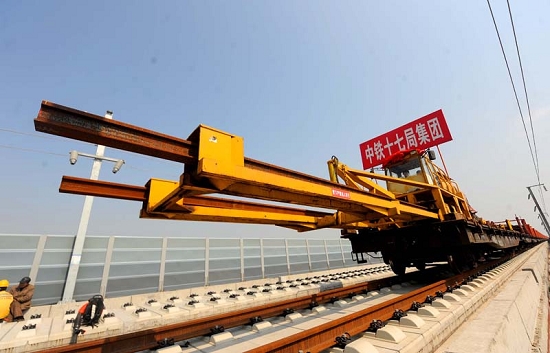 正在施工中的杭宁高铁目前在浙江境内已经完成钢轨铺设约100公里,完成杭宁高铁浙江境内钢轨铺设总长度的一半。施工方中铁十七局的施工人员正在利用近日的晴好天气加紧铺轨进度,每天可以完成约6公里的轨道铺设。杭宁高铁铺设的钢轨每根长500米,重30吨,施工方预计将于7月份完成杭宁高铁的全线铺轨。杭宁高铁由南京南站到杭州东站,全长近250公里,设计时速为350公里,预计今年10月进行全线的联调联试,年底前通车。