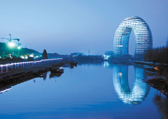 码头不远处,一座呈指环型的建筑——太湖明珠酒店(喜来登温泉度假酒店)在阳光下熠熠发光。这座被业内专家誉为可与迪拜帆船酒店媲美的建筑,尽揽流波与空间的动静之美。