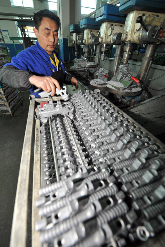 浙江省温岭市一家气动工具厂的工人在制造出口的气动工具零件(2月11日摄)。