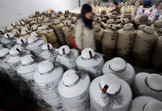 浙江省温岭市一家制帽厂刚刚制作完成的一批帽子准备出口(4月10日摄)。