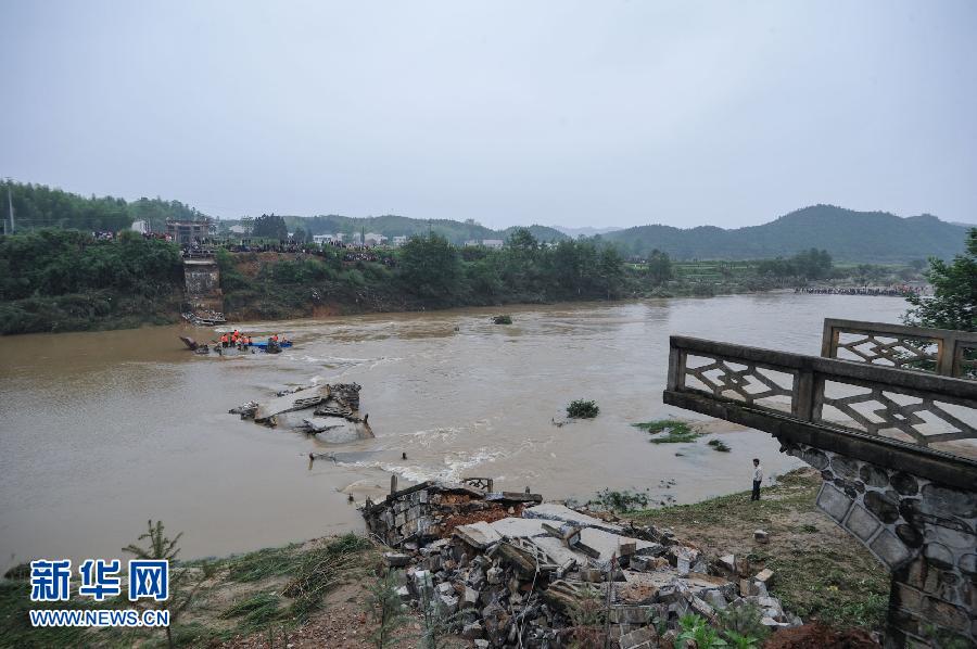 5月13日,垮塌桥体的残骸散落在河中。当日8时30分许,由于连续暴雨,致使湖南省平江县梅仙桥镇与余坪乡交界附近一座大桥突然发生垮塌。据现场救援人员介绍,发生险情的大桥是一座公路桥。消防部门接到报警后,迅速赶往现场,全力展开救援工作,截至发稿时,除落水后自行爬上岸的遇险人员外,还没有救援出其他人员。大桥垮塌时桥上人员行走情况正在进一步的调查核实中。新华社记者白禹摄