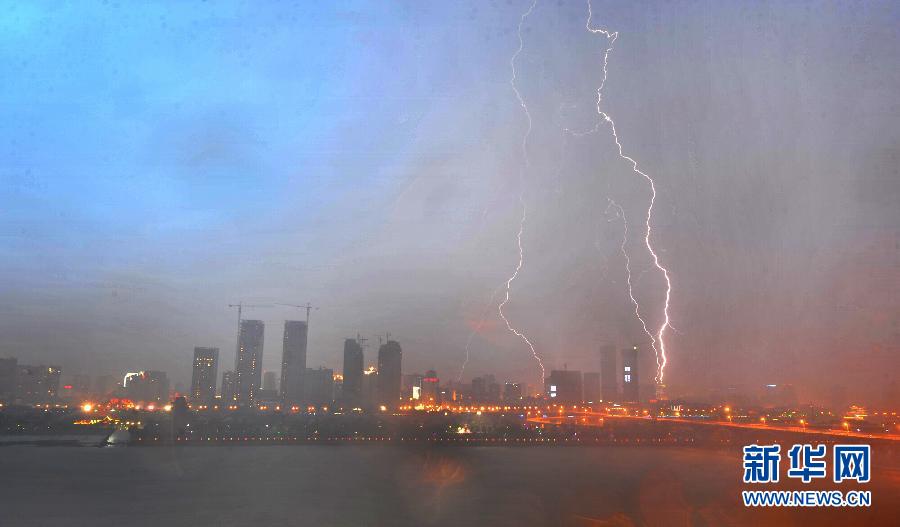 雷电袭击下的长沙湘江沿岸主城区(5月8日摄)。 5月8日,古城长沙大雨倾盆、雷电交加,造成主城区能见度低,给市民出行带来不便。当地气象部门预计,未来三天长沙有一次较明显的降水、强雷电和雷雨大风等强对流天气过程。新华社记者 龙弘涛 摄