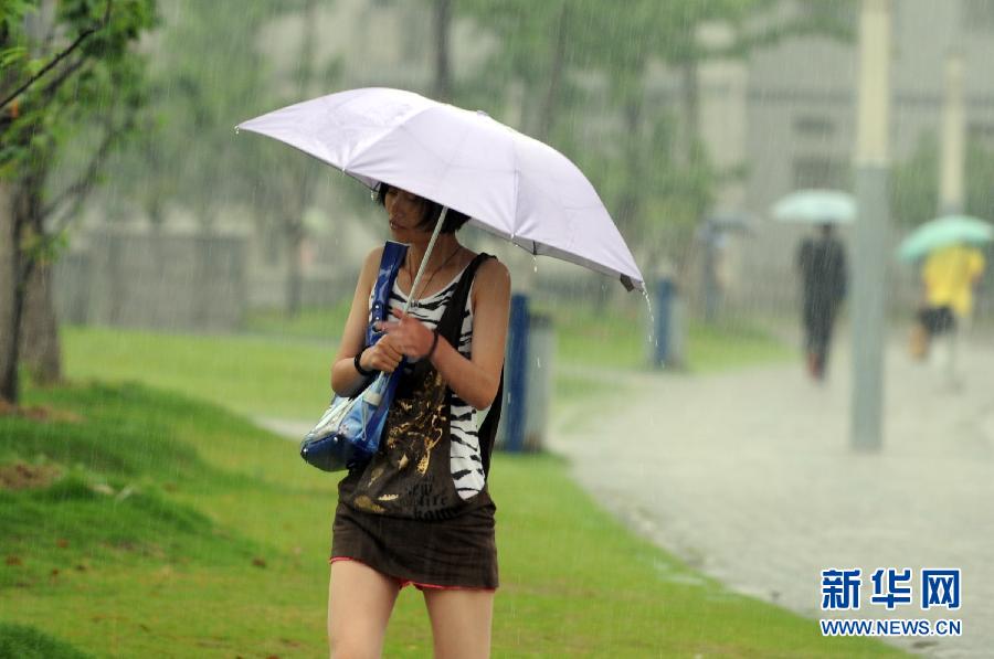5月7日,一位女士在雨中行走。当日,合肥市降下今年第一场暴雨,中央气象台于当日18时发布暴雨蓝色预警,预计7日20时至8日20时安徽中南部将有大到暴雨。 新华社记者杜宇 摄
