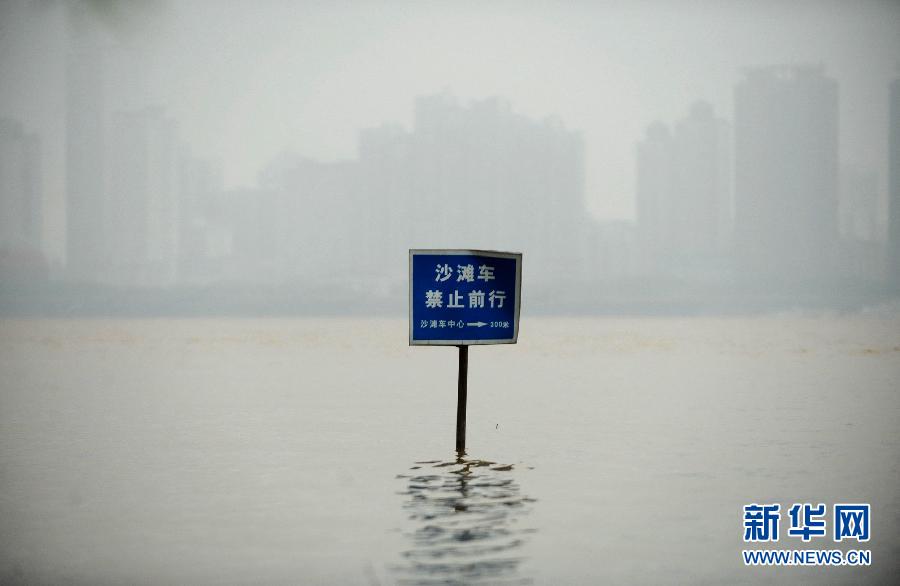 5月3日,一块立在南昌红谷滩岸边的警示牌被上涨的江水淹没。连日强降雨使江西赣江水位迅速上涨,据江西省水文局统计,赣江南昌段3日水位已经达到19.94米,比5天前高出逾1米。 新华社记者 周密摄