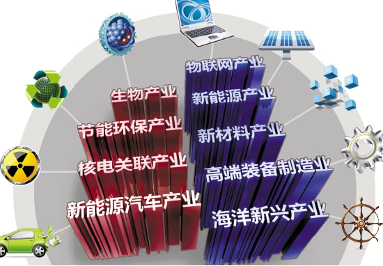 2010年7月,我省确定九大战略性新兴产业:生物产业、新能源产业、高端装备制造业、节能环保产业、海洋新兴产业、新能源汽车、物联网产业、新材料产业以及核电关联产业等。发挥传统产业块状经济优势,大力发展战略性新兴产业,成为处在十字路口的浙江经济转型升级的战略选择。