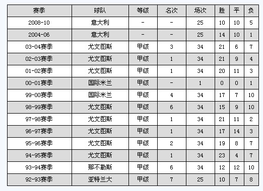 曾执教的球队:庞特德拉、锡耶纳、皮斯托伊塞、卡拉雷塞、切塞纳、卢切塞、亚特兰大、那不勒斯、尤文图斯(微博)、国际米兰(微博)、意大利国家队