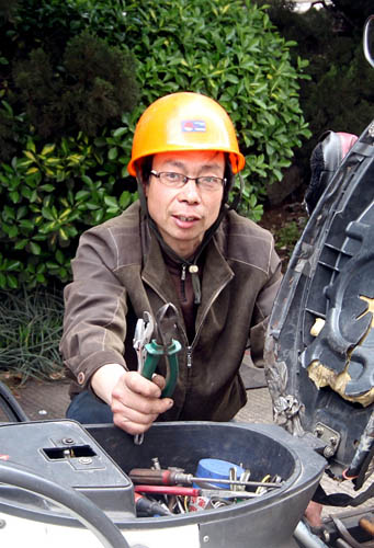 吴雄文的免费“修车史”,可以追溯到1990年,源于他一次骑自行车上班路上被扎破车胎的经历,当时可真是着急又上火。想到别人也会遭遇同样的事,从此他就随车携带维修工具和零配件,改骑电动车后又琢磨着将自己那辆电动车进行改造,将电瓶改放在底部,对腾出来的空槽和后座的储物箱进行了分隔,上层是万能表、电池容量表、钳子、锤子、打气筒等维修工具,下层是维修用的零配件,于是电动车变成了随带“百宝箱”的“移动修车摊”。本来他骑车到单位只要10来分钟,如今每天早上都提早近1个小时出发,车骑到哪里就修到哪里,下班也是一样。