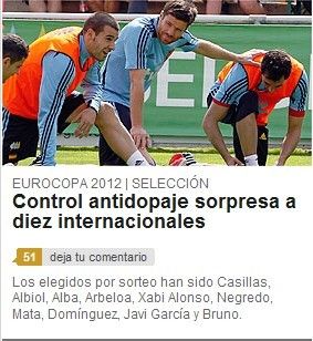 在奥利地的施伦斯,西班牙国家队完成了当天的训练。欧足联反兴奋剂委员会抽查了10名西班牙球员。卡西利亚斯、阿尔比奥尔、阿尔巴、阿贝罗阿、多明戈斯、阿隆索、哈维-加西亚、布鲁诺、内格雷多和马塔,这10人接受了血液和尿样检测。