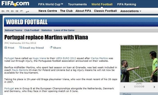 北京时间5月23日晚,葡萄牙足协通过其官网宣布,国脚卡洛斯-马丁斯因伤将无缘欧洲杯,29岁的布拉加中场核心乌戈-维亚纳入替。