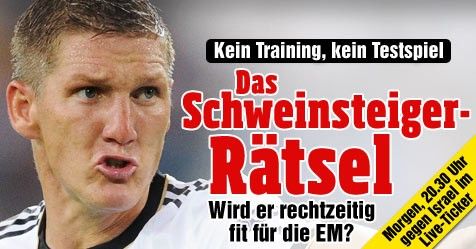 在周三的德国队训练中,球队队副、中场核心施魏因斯泰格小腿受伤,提前离开训练场。在刚刚受伤不久,乐观的小猪还表示自己并无大碍。但今天德国领队比埃尔霍夫宣布,队副很有可能无法参加明天对以色列的欧洲杯热身赛。德国媒体担心,本赛季屡遭伤病打击的施魏因斯泰格会在关键时刻被伤病击垮,可能无缘今夏欧洲杯的首场比赛,就和06年世界杯时的巴拉克一样。